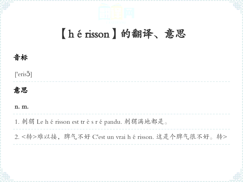 <转>难以接,脾气不好 C'est un vrai hérisson. 这是个脾气很不好。转>