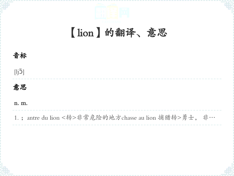 ;antre du lion <转>非常危险的地方chasse au lion 捕猎转>勇士, 非凡者<俗>C'est un lion. 他一个勇敢的人。Ces jeunes soldats furent des lions. 这些年轻士兵都勇敢的人。俗>n.inv. et adj.inv.座(的)Elle est lion. 她座的。