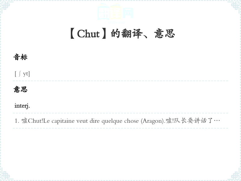 嘘Chut!Le capitaine veut dire quelque chose (Aragon).嘘!队长要讲话了。(阿拉贡)Il mit un doigt sur la bouche et fit “chut!”他把一个手指放在嘴边,说了一声“嘘!”