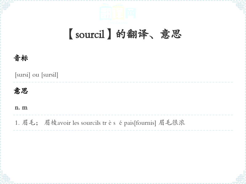 眉毛; 眉棱avoir les sourcils très épais[fournis] 眉毛很浓