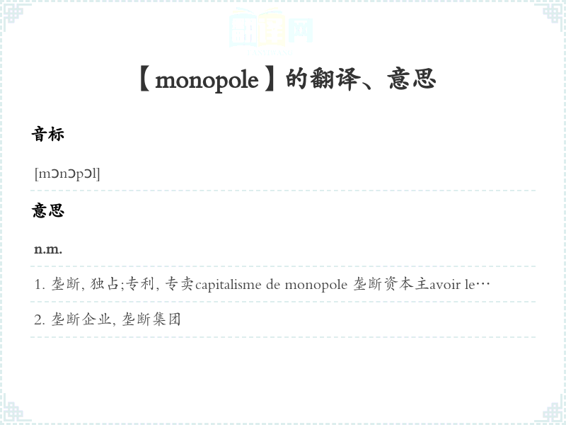 垄断, 独占;专利, 专卖capitalisme de monopole 垄断资本主avoir le monopole d'un produit垄断一种产品s'attribuer le monopole de l'intelligence〈转〉认为只有自己聪明