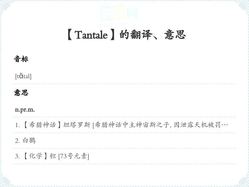 【希腊神话】坦塔罗斯 [希腊神话中主神宙斯之子, 因泄露天机被罚永世站在上有果树的中, 深及下巴, 口渴时即减退, 腹饥吃果子时树枝即升高。]supplice de tantale 〈转义〉可望而不可及的难熬的痛苦n.m.