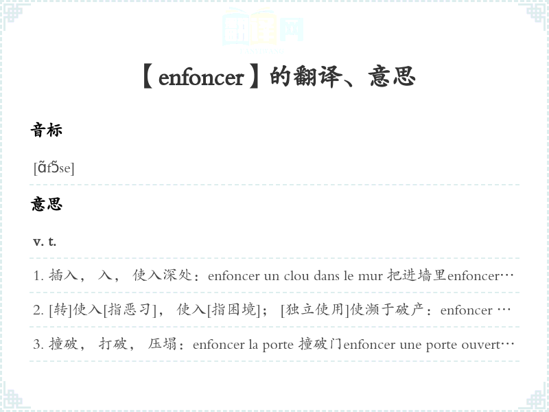 [喻]击败, 胜过:enfoncer qn 击败某人v. i.进入深处:enfoncer dans le sable 入沙里Ce navire enfonce dans l'eau de tant de mètres. 此船吃水若干米。 La barque enfonça brusquement. 小船突然沉没。s'enfoncer v. pr.