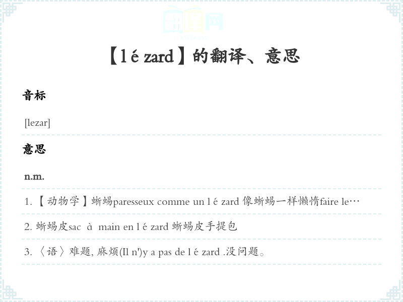 〈语〉难题, 麻烦(Il n')y a pas de lézard .没问题。