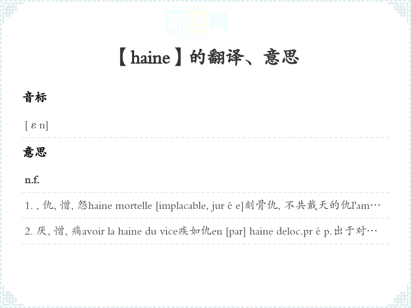 厌, 憎, 痛avoir la haine du vice疾如仇en [par] haine deloc.prép.出于对…的仇organiser la révolte en haine des oppresseurs出于对压迫者的仇而组织反抗