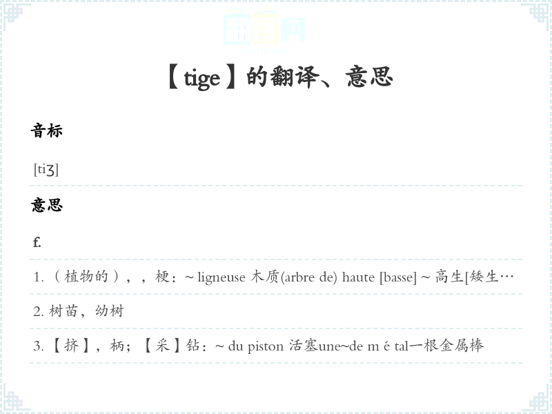 香烟,纸烟常见用法une tige de bois一根木une tige de métal一根金属口>转>转>