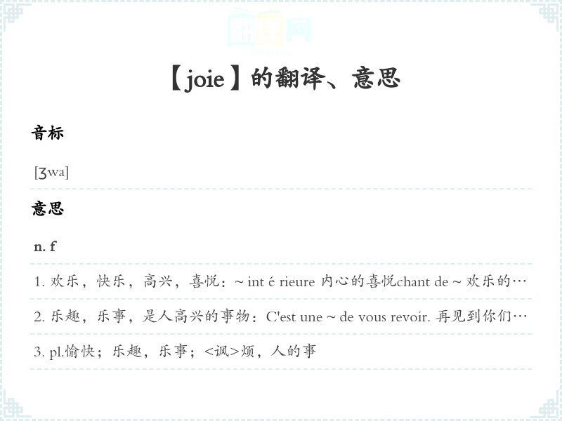 乐趣,乐事,是人高兴的事物:C'est une ~ de vous revoir. 再见到你们真让人高兴。se faire une ~ de faire qch. 乐于做某事,以做某事为乐être[faire] la ~ de qn 是某人的快乐,是某人的慰籍les ~s de la vie 生活的乐趣,人生乐事les livres ont fait sa seule joie pendant sa maladie. 书是他生病期间唯一的消遣。