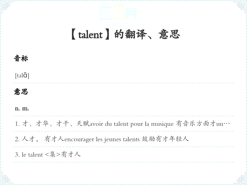 才、才华、才干、天赋avoir du talent pour la musique 有音乐方面才un artiste de talent 有才华艺术家Montrez-nous vos talents. <口>露一手给大家看看口>