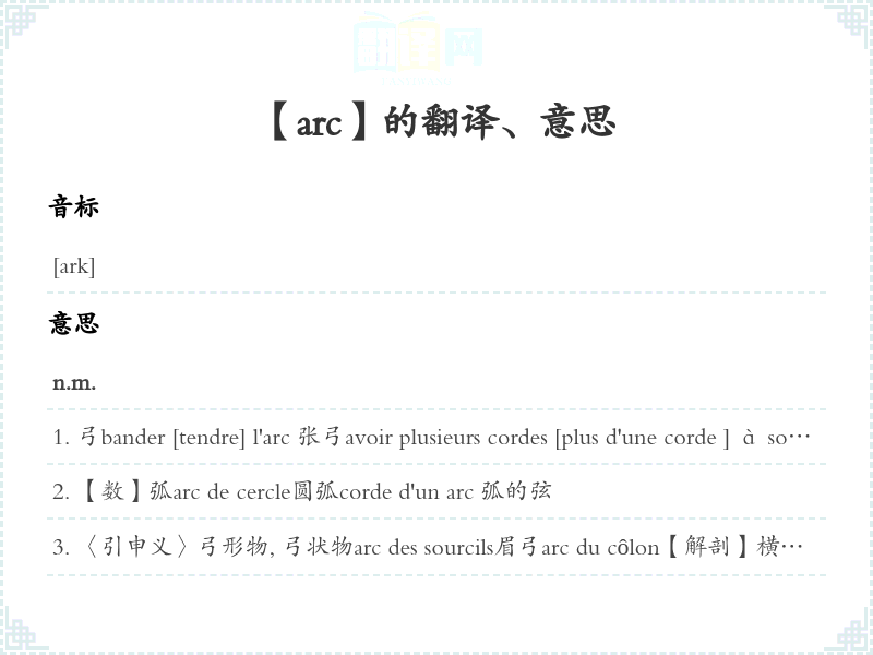 〈引申义〉弓形物, 弓状物arc des sourcils眉弓arc du côlon【解剖】横结肠arc réflexe【生理】反射弧arc électrique【电】电弧lampe à arc 【电】弧光灯