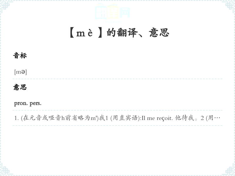 (在元音或哑音h前省略为m')我1 (用直宾语):Il me reçoit. 他待我。2 (用宾语, 表示“对我”, “给我”):Il veut me parler. 他想要跟我说话. Donnez m'en 请给我一些3 (用形容词、表语补语, 表示“对我说”):Votre conseil m'est très chef. 你劝告对我很宝贵4(在falloir, faire, laisser等动词后不定式句中主语):Il me faut obéir à la règle. 我应该遵守规章。 Il me laissera lire ce livre. 他将让我阅读这本书。5 (代替mon, ma, mes):Le cœur me bat fort. 我心跳得厉害。6 (加强语气用法):Va me fermer cette porte!去把这门给我关上!7 (用自反人称代词):Je me suis blessé moi-même. 我是自己弄伤8 (和voici, voilà连用):Me voilà tranquille. 我现在可安心了.