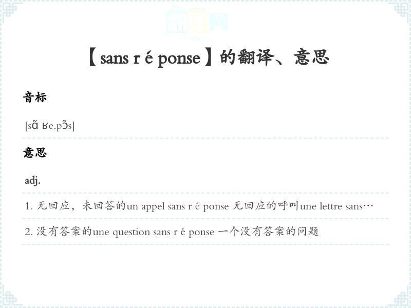 无回应,未回答的un appel sans réponse 无回应的呼叫une lettre sans réponse 一封未回复的信