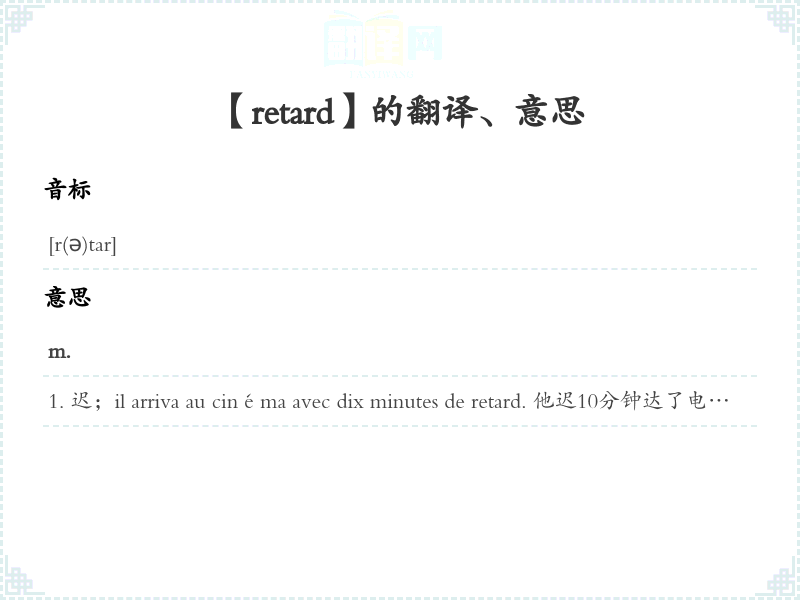 迟;il arriva au cinéma avec dix minutes de retard. 他迟10分钟达了电影院。 迟缓, 耽搁;travail en retard 耽误了工作avoir du courrier en retard 有未及时回复信件sans retard 毫不拖延,及时,尽快;un pays en retard du point de vue économique 一个经国家retard technique 技术减速; [药]长效