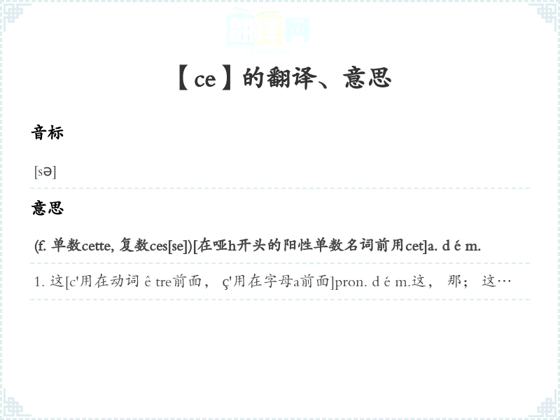 这, 那; 这, 那[指人事物]1[用作无人称主语, 强调语气]Ce doit être lui. 大概是他。 Ce ne peut être cela. 不可能是这。 C'est nous. 是我们。 Ce sont eux. 是他们。 C'est mon ami et son frère. 这二位是我朋友他兄弟。 Ç'a été un brave homme. 他当初是正直的人。 Ce n'est pas des romans, c'est des dictionnaires. 这些不是小说, 是词典。 [口语中语表语可不一致]si ce n'est. . . 除此, 除非, 莫非…fût-ce. . . 哪怕是…2[用于疑问句中]Est-ce vous?是您吗?Est-ce que vous viendrez ce soir?今天晚上您来吗?Qu'est-ce(que c'est)?<口>Qu'est-ce que c'est que cela?这是什么?这是怎么一回事?ce que c'est que是什么 口>3[用于句首表示强调]C'est. . . qui, C'est. . . que是…4c'est à. . . de. . . 这是应该由…去…; 真要…5[代词合用, 作为主语、宾语、表语等]Voyez ce qui se passe. 请看一下发生了什么事。 瞧瞧眼下所发生的事。 Faites ce que je vous dis. 按我跟您说的做吧。 à ce que je crois在我想来à ce qu'il me semble依我看ce dont on parle所谈论的这件事情Voici ce à quoi j'avais pensé. 这就是我曾经想过的。 Sa santé n'est pas ce qui me préoccupe. 我担心的并不是他的健康。6 ce que<口>多么7[用作直接宾语]口>ce dit-il<古>他说了这ce me semble我觉得这样pour ce faire为了做这件事; 为此目的 古>8[现在分词一起, 构成独立分词句, 用在句首]ce disant说着9[用作介词的补语]sur ce于是, 随后, 这时候