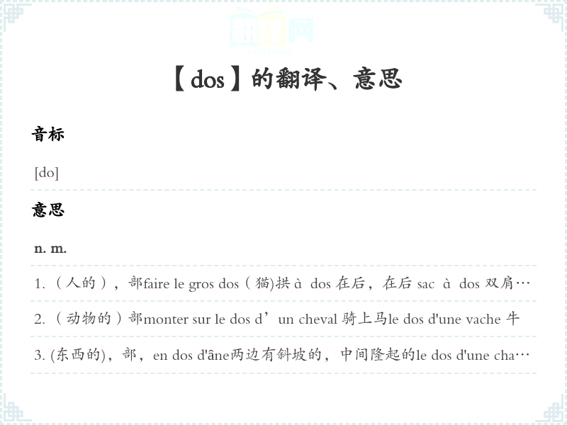 (东西的),部,en dos d'âne两边有斜坡的,中间隆起的le dos d'une chaise 椅 dos et plante du pied脚和脚底 dos du nez 鼻梁 l'endroit et le dos de la feuille 纸张的正反signer au dos d'un chèque 在支票字voir au dos 见反dos d'un livre 书脊