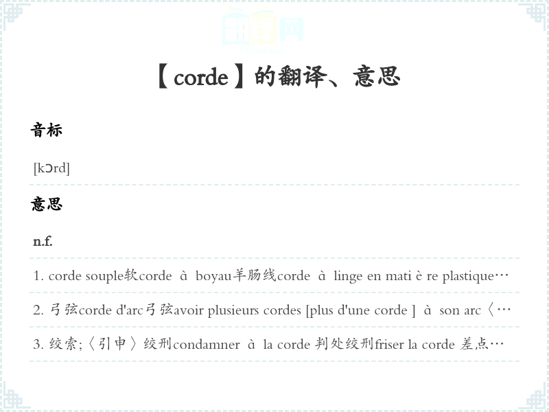 绞索;〈引申〉绞刑condamner à la corde 判处绞刑friser la corde 差点被判绞刑;应判绞刑homme de sac et de corde 十恶不赦的坏蛋Il ne vaut pas la corde pour le pendre.绞死他还嫌浪费了。 [喻十恶不赦, 卑鄙透顶]se mettre la corde au cou使自己陷入不能自主的困难境地;〈讽刺语〉结婚成家Il ne faut point parler de corde dans la maison d'un pendu.在有人吊死过的家别提。 [喻讲话要看对象场合]