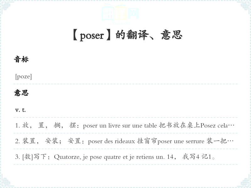 放, 置, 搁, 摆:poser un livre sur une table 把书放在桌上Posez cela à (par)terre. 把这个放在上。 poser un objet droit 把东西直放。 poser un objet de travers (plat) 把东西横[平]放poser son regard sur … [引]把目光投向 …