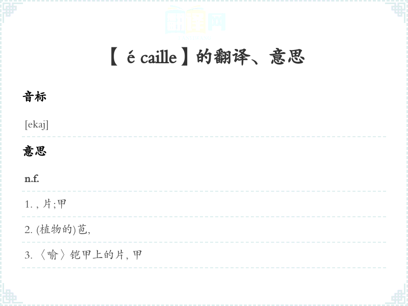玳瑁的角质板;〈引申义〉玳瑁状合成树脂peigne en écaille 玳瑁梳子lunettes à monture d'écaille 玳瑁架眼镜veau écaille (作书面用的)纹小牛皮