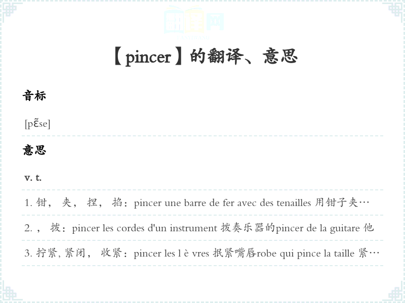 拧紧, 紧闭, 收紧:pincer les lèvres 抿紧嘴唇robe qui pince la taille 紧腰身的连衫裙