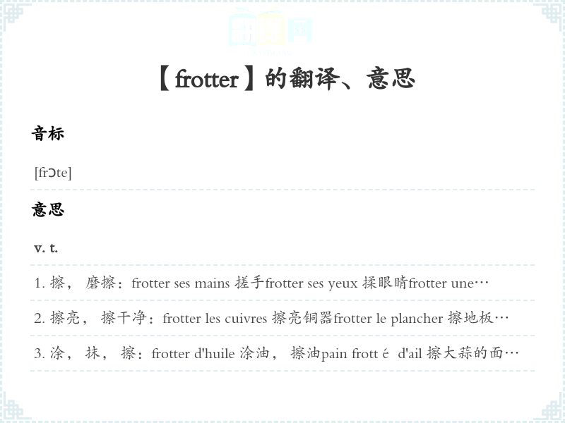 涂, 抹, 擦:frotter d'huile 涂油, 擦油pain frotté d'ail 擦大蒜的面包être frotté de … [旧, 转]懂些…对 …知:être frotté de français 懂点法语