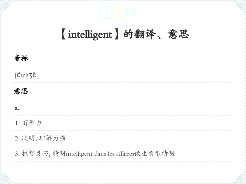 1.intelligence n.f. 智慧,智力;聪明;才智;机智,灵巧,精明