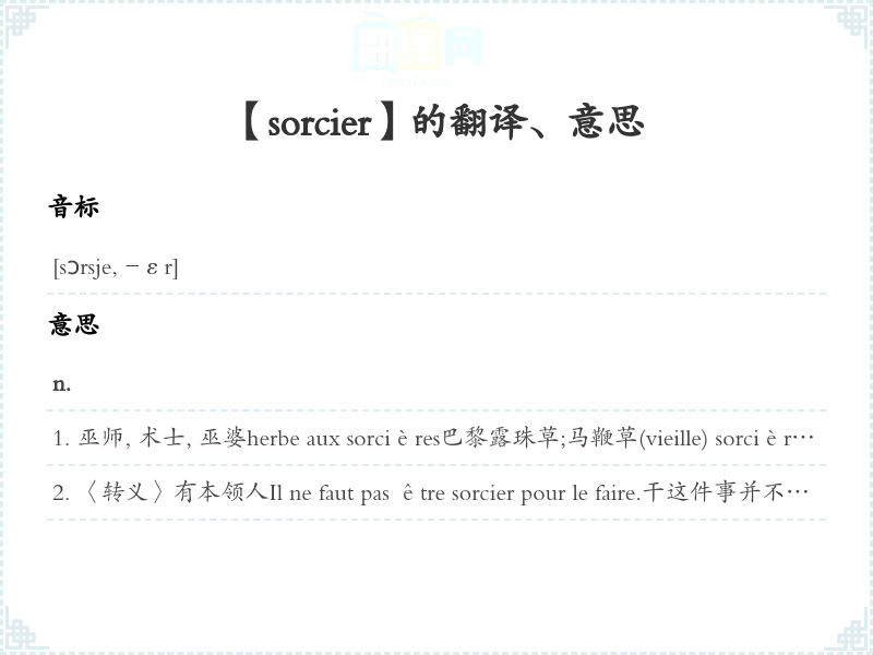 巫师, 术士, 巫婆herbe aux sorcières巴黎露珠草;马鞭草(vieille) sorcière〈转义〉〈口语〉老妖婆 [指丑陋或凶狠老婆子]