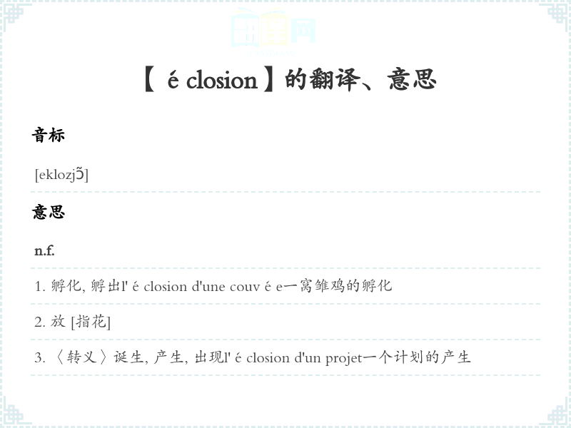 〈转义〉诞生, 产生, 出现l'éclosion d'un projet一个计划的产生