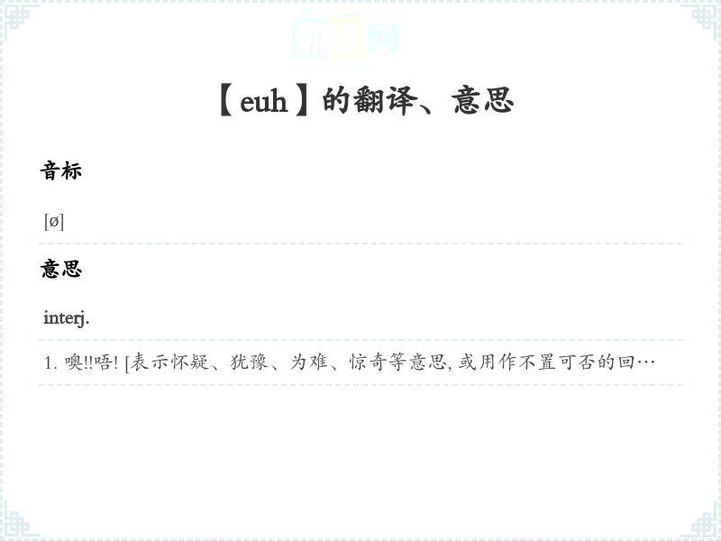 噢!!唔! [表示怀疑、犹豫、为难、惊奇等意思, 或用作不置可否的回答]C'est comme je vous le dis!— — Euh! vous êtes sûr? 我跟您讲的是事实! — —噢!您能肯定吗?Alors, cela vous plaît?— — Euh! euh! !... 那么, 这个中您的意吗? — —!!…