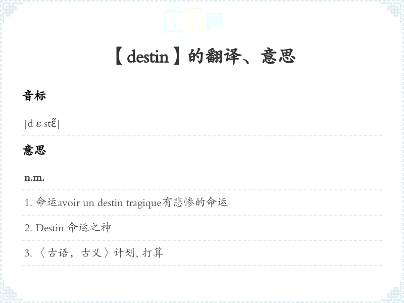【destin】 助记:、 派生:、 名词变化:、 形容词变化:、 近义词:、 反义词: 联想词