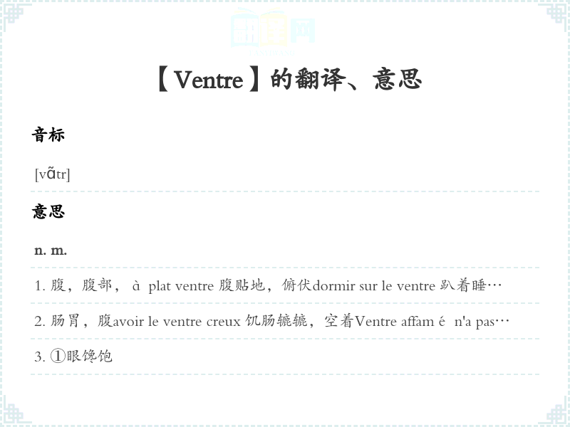 【Ventre】 联想:、 形容词变化:、 近词:、 词: 联想词