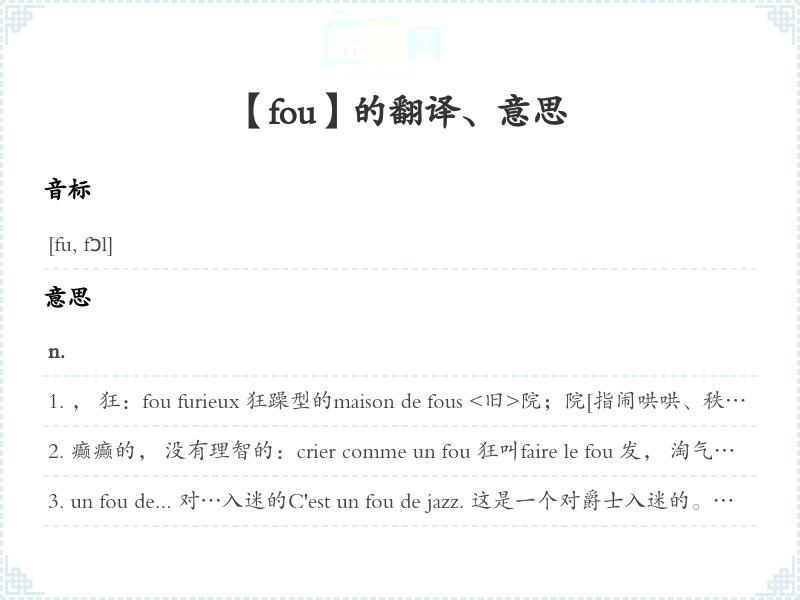 过分的,过多的,巨大的;不可思议的,异常的Il y a un monde fou. 有数不清的。prix fou 奇昂的价钱un succès fou 巨大的成功mal de tête fou 剧烈的头痛n.f.女性化的男同性恋者