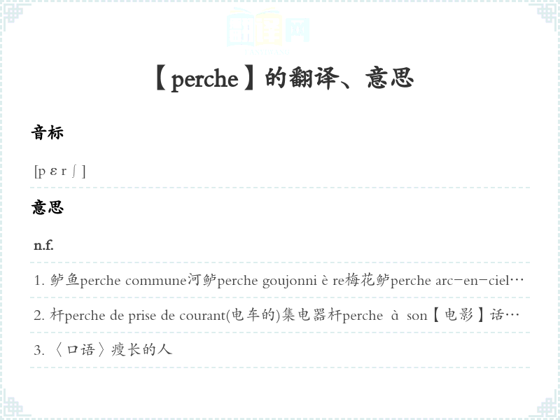 杆perche de prise de courant(电车的)集电器杆perche à son【电影】话筒吊杆saut à la perche 【体育】撑杆跳高conduire un bateau à la perche 用篙撑船tendre la perche à qn〈转义〉拉某人一把
