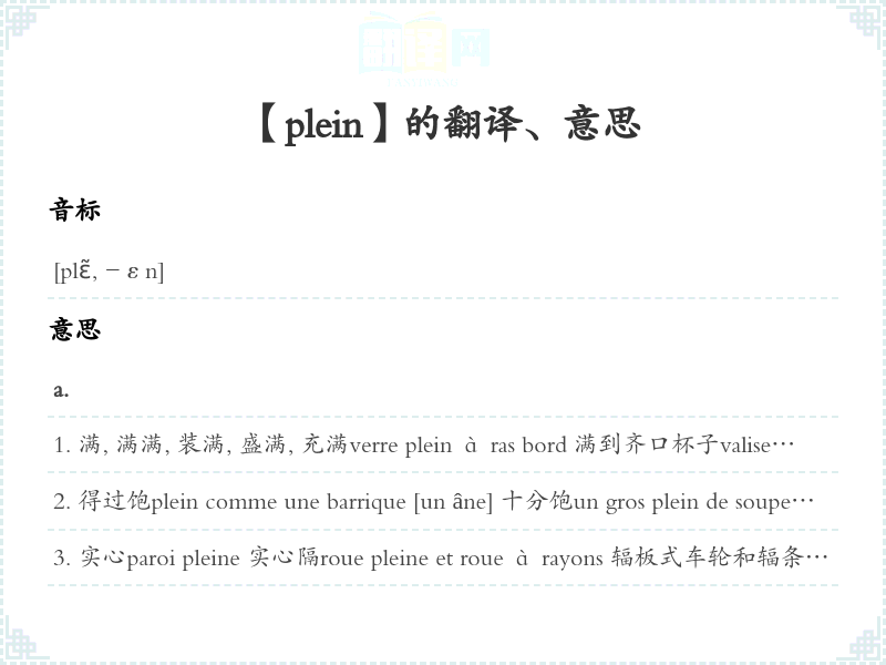 装满, 盛满avoir de l'argent plein les poches 口袋里满满是钱avoir du poil plein les joues〈口语〉满脸都是胡子en avoir plein la bouche〈转义〉把这个经常挂在嘴上en avoir plein les bottes〈口语〉走得太累了en avoir plein le dos〈口语〉对此已感到厌烦en mettre plein la vue à qn〈口语〉给某人强烈感受, 诱惑某人plein deloc.prép.许多, 很多Il y a plein de monde dans la rue. 街上全是人。adv.sonner plein (实心物体被叩击时)发出实声 / tout plein 〈口语〉非常, 很Vous êtes gentil tout plein. 您实在太好了。n.m.