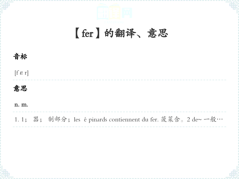 1; 器; 制部分;les épinards contiennent du fer. 菠菜含。2 de~ 一般的, 钢般的, 结实的, 有力的, 坚定的, 坚硬的, 固执的3器具, 武器等的制或部分4制器具fer à repasser 熨斗fer à friser 烫发钳5钢筋, 型钢; 型材fer en U 槽6剑, 花式剑7 pl. <旧>产钳8鱼钩9un fer à cheval 马10 pl. 铐, 锁链; <书>奴隶, 被奴役书>旧>