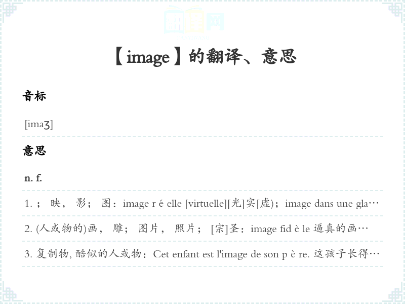 (人或物的)画, 雕; 图片, 照片; [宗]圣:image fidèle 逼真的画像;un chasseur d'images 新闻片摄影师; 猎奇的摄影记者