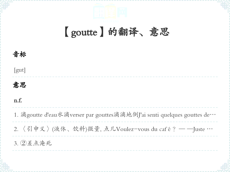 【药学】滴;pl. 滴剂ne... goutteloc.adv.点也没有, 点也不 [与动词 voir, entendre, comprendre, connaître 合用]n'y entendre goutte 点也不懂goutte à goutteloc.adv.滴滴地, 点滴地verser un liquide goutte à goutte 滴滴地倒出某液体n.f.【医学】痛风goutte (articulaire)关节性痛风goutte saturnique铅毒性痛风une attaque de goutte 痛风发作