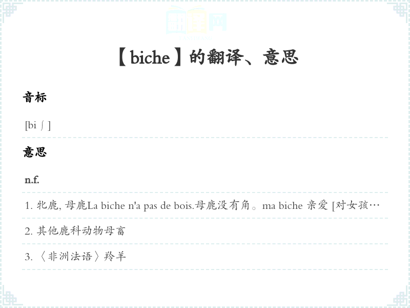 牝鹿, 母鹿La biche n'a pas de bois.母鹿没有角。ma biche 亲爱 [对女孩和年轻妇女爱]meuble à pieds de biche 家具ventre de biche 淡赭色