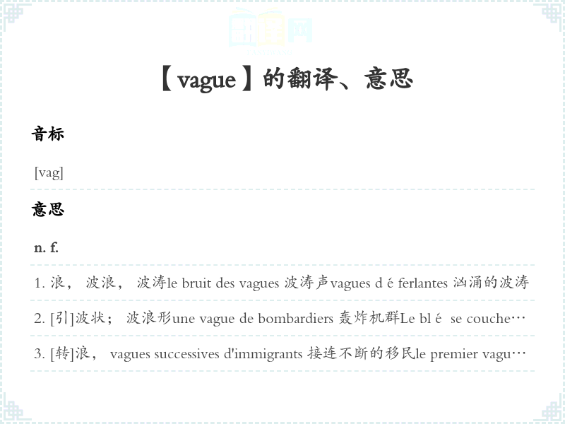 模的, 隐隐约约的une forme vague dans la nuit 夜里模的身影lumière vague 朦胧的光线des souvenirs vagues 模的回忆un vague espoir 渺茫的希望