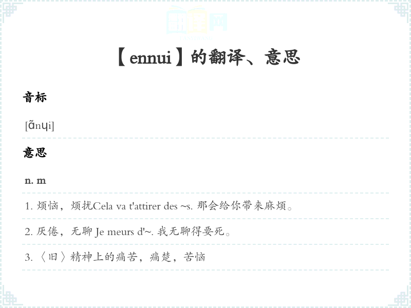 【ennui】 联想:、 动词变化:、 近义词:、 反义词: 联想词