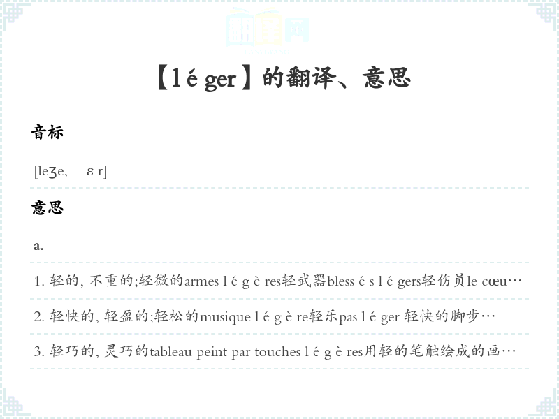 轻快的, 轻盈的;轻松的musique légère轻乐pas léger 轻快的脚步poésie légère轻快的诗rôle léger 要求有轻快自如的歌喉的角色taille légère轻盈的体voix légère轻快自如的歌喉danseuse légère comme un papillon蝴蝶般轻盈的舞女