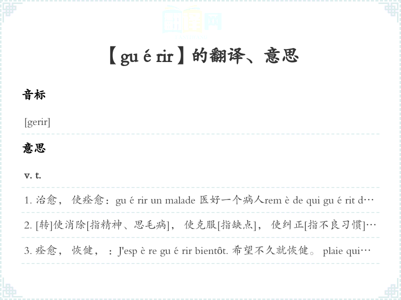 治愈, 使痊愈:guérir un malade 医好一个病人remède qui guérit de la fièvre 退热药[宾语省略]l'art de ~ 医学, 治疗学