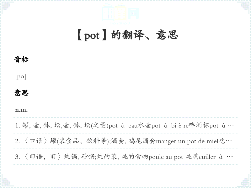 〈旧语,旧〉炖锅, 砂锅;炖的菜, 炖的食物poule au pot 炖鸡cuiller à pot 大汤勺en deux coups de cuiller à pot 〈口语〉转手间recevoir qn à la fortune du pot 〈口语〉留某人吃便饭tourner autour du pot 〈转〉〈口语〉(说话, 行事)转弯抹角, 兜圈子Cela fera bouillir le pot .〈转〉这可补贴家用。