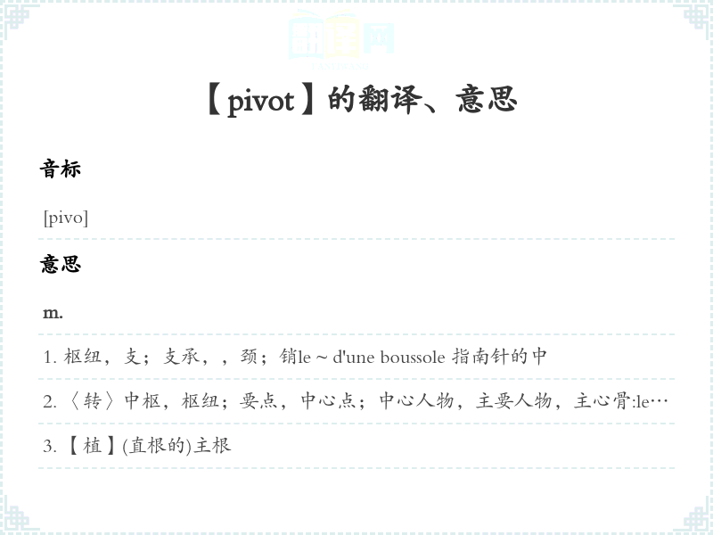 〈转〉中枢,枢纽;要点,中心点;中心人物,主要人物,主心骨:le ~ d'une entreprise 一企业的主心骨cours [taux] ~ 【财】[欧洲货币制度的]中心汇率;标准汇率