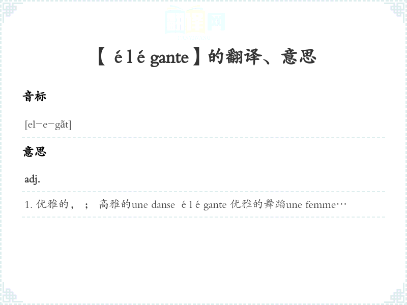 优雅的, ; 高雅的une danse élégante 优雅的舞蹈une femme élégante 优雅的女性un style élégant 优雅的风格