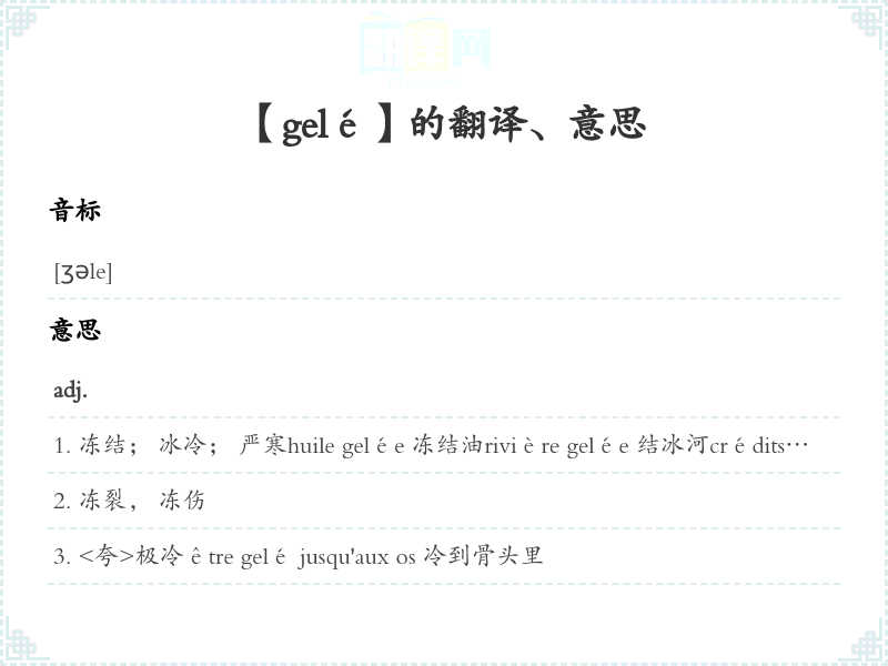 冻结; 冰冷; 严寒huile gelée 冻结油rivière gelée 结冰河crédits gelée 【经】冻结信贷