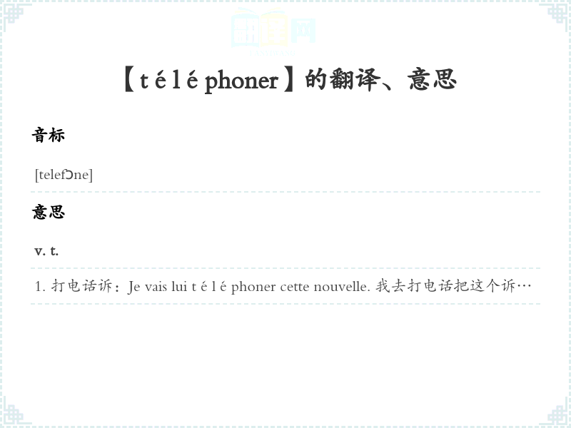 打电话诉:Je vais lui téléphoner cette nouvelle. 我去打电话把这个诉他。 téléphoner une nouvelle à qqn 打电话把诉某人message téléphoné 话传电报[由邮局记录作为电报发送的电话]v.t.indir.,v.i.打电话, 通电话:téléphoner chez/à qn 某人打电话Je vous téléphonerai pour vous donner de mes nouvelles. 我会打电话把我的情况诉你。