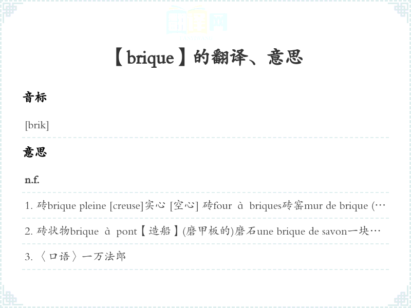 【brique】 词源:、 派生:、 近义词、 同音、近音词 联想词