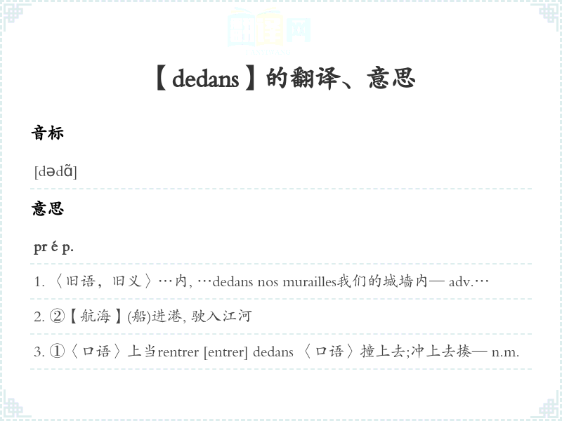 【dedans】 联想:、 近义词:、 反义词: 联想词