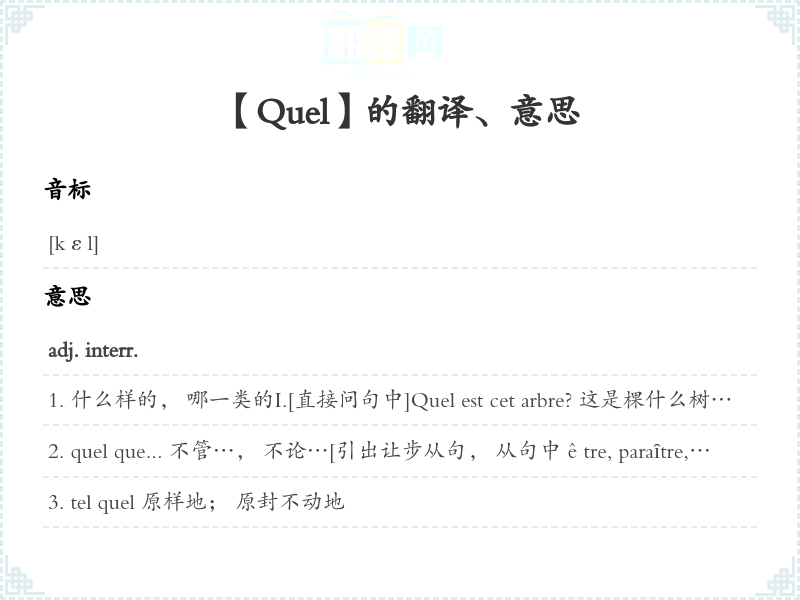 什么样的, 哪一类的I.[直接问句中]Quel est cet arbre? 这是棵什么树?Quelle est cette jeune fille qui chante? 这个唱歌的姑娘是谁呀?Quelles observations avez-vous faites? 您提了些什么意见?Quelle heure est-il? 点钟?II. [间接问句中]Dites-moi quel jour nous sommes. 请告诉我今天号。III. [与动词savoir构成泛指 a. 短语]Il a trouvé cette phrase dans je ne sais quel livre. 不知道他哪本书里找到这个句子的。 ne plus savoir sur quel pied danser 不知怎样才好adj. exclam.么,Quelle belle perspective! 么美好的前景呀!Quelle idée! 可笑的念头!荒唐的念头!pron. interr.哪一个Quel est le plus grand des deux? 这两个中哪一个大?adj. rel.