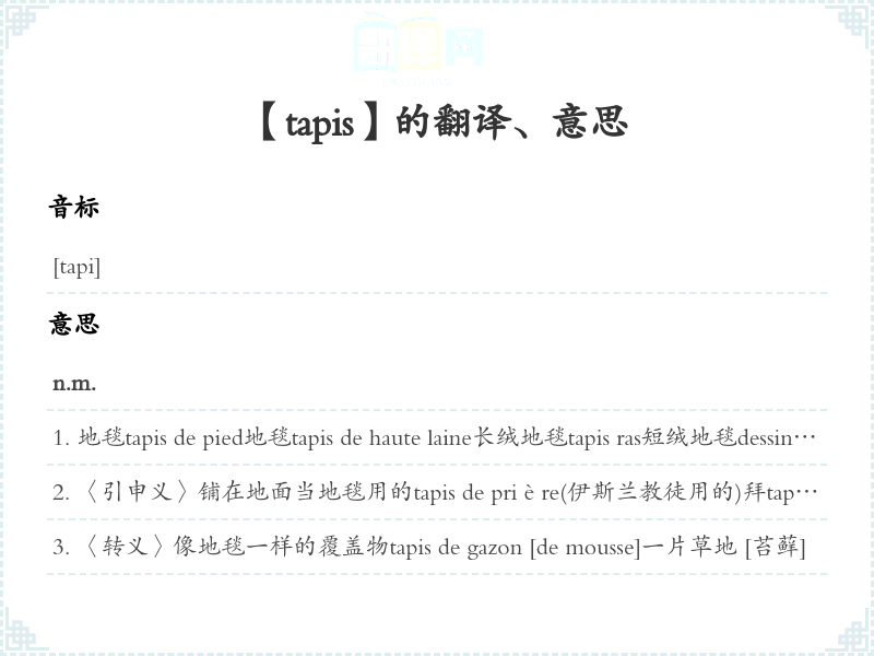 〈引申义〉铺在地面当地毯用的tapis de prière(伊斯兰教徒用的)拜tapis de caoutchouc橡胶地毯, 铺地橡胶tapis de linoléum地漆布tapis de sol(野营时的)铺地防潮布envoyer son adversaire au tapis (拳击中)把对手打翻在地tapis roulant传送带, 输送带