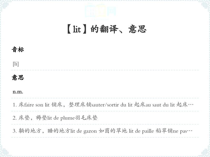躺的地方,睡的地方lit de gazon 如茵的草地 lit de paille 稻草铺ne pas être sur un lit de roses 〈转〉处境艰难